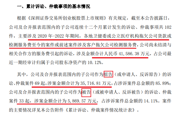 一年内打了102场官司、仲裁,涉案金额4.16亿,这是凯普生物及其子公司在最近一年累计涉及的诉讼、仲裁案件。