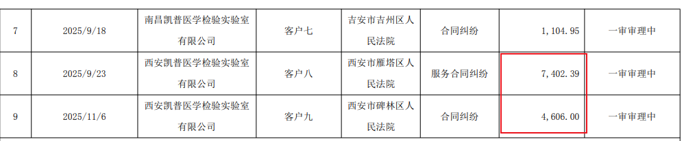 据公告披露,西安凯普医学检验实验室还被同一供应商,以合同纠纷为由,分别在西安市碑林区人民法院和延安市宝塔区人民法院起诉,涉案金额分别为2,821.17万和1,303.25万,总金额高达4124.42万。占未结案件涉案金额的78%。